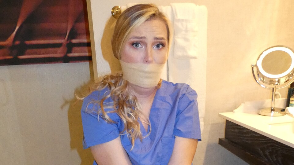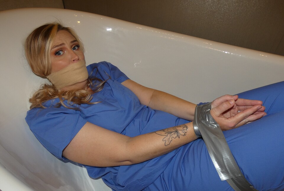Amanda just gets home from work and as she walks into her bathroom she is grabbed from behind with a cloth over her nose. When she wakes she is taped up sitting on a stool. But after several miutes of protesting she has a pair of her panties shoved into her mouth and then some bandage wrap is put around her mouth to hold them in place. Then she is put into the bathtub where her captor plans on keeping her until she calms down threstening to turn the water on.