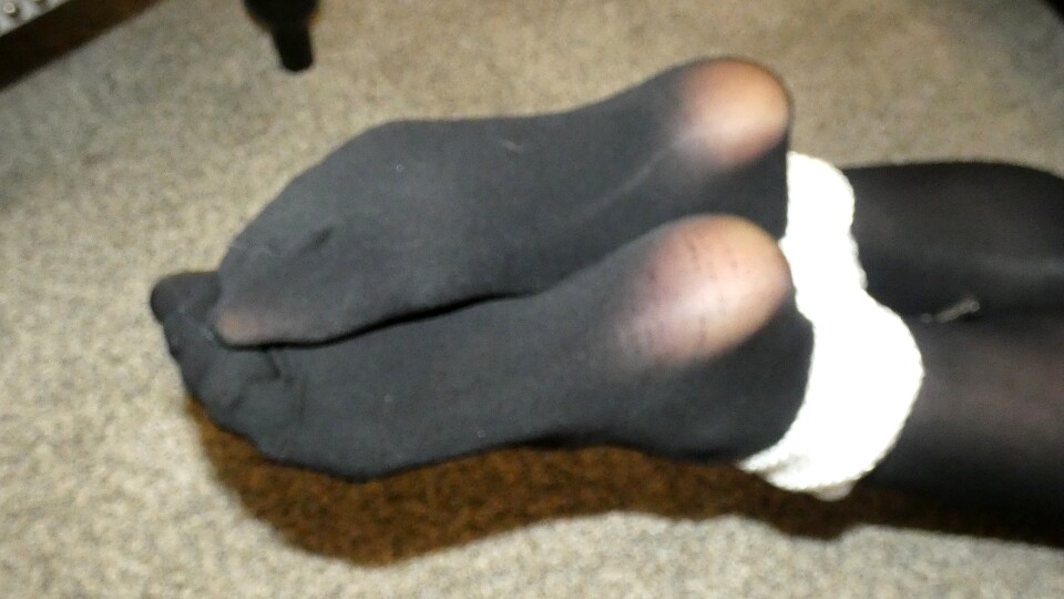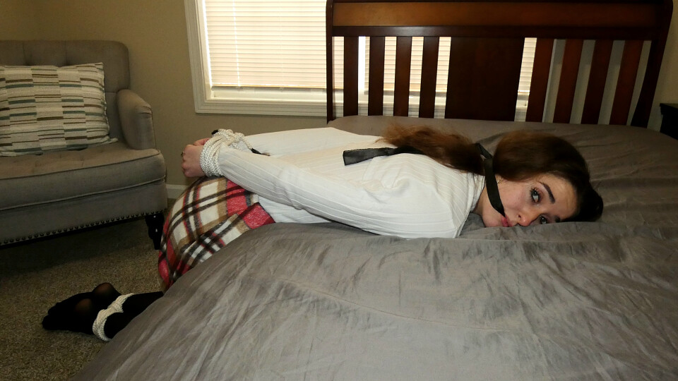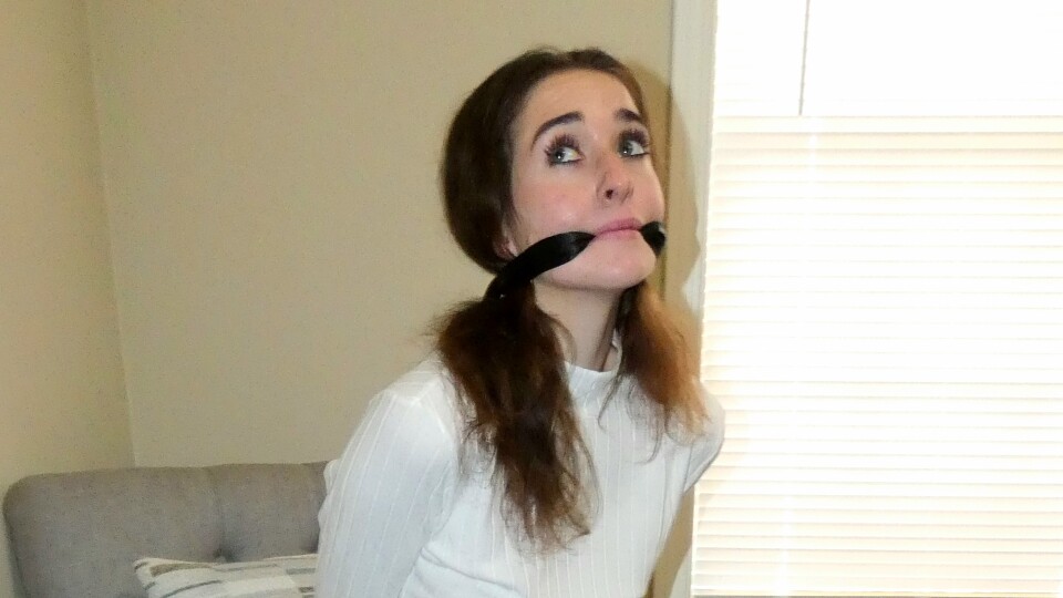Ana Lynn Tied up in a white sweater and plaid skirt with pantyhose and heels. She has a black cleave gag between her teeth.