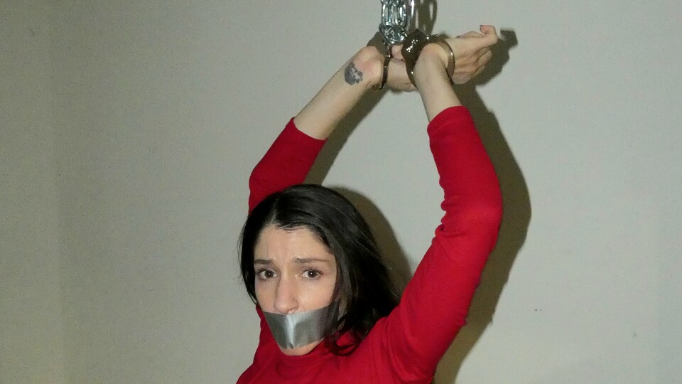 Arielle is Paula Peril who has snuck into a home looking for some clues to bring down one of her biggest enemies. She is trying to get in a locked room when she is grabbed and dragged off. She is taken into a garage and has her hands cuffed over head. She is interogated but refuses to give any information. Since she wont talk she has tape put over her mouth and is threatned to be blown up with a bomb. After multiple chances she has a cloth put over her nose to put her out. She wakes bound with rope in a utility closet and gagged with white OTM gag. The bomb is set and she struggles relentlessly to free herself. As time comes close to ending the Villan closes the door on Paula leaving her alone in the dark wondering how she will get out of this. Is this the end for Paula Peril?
