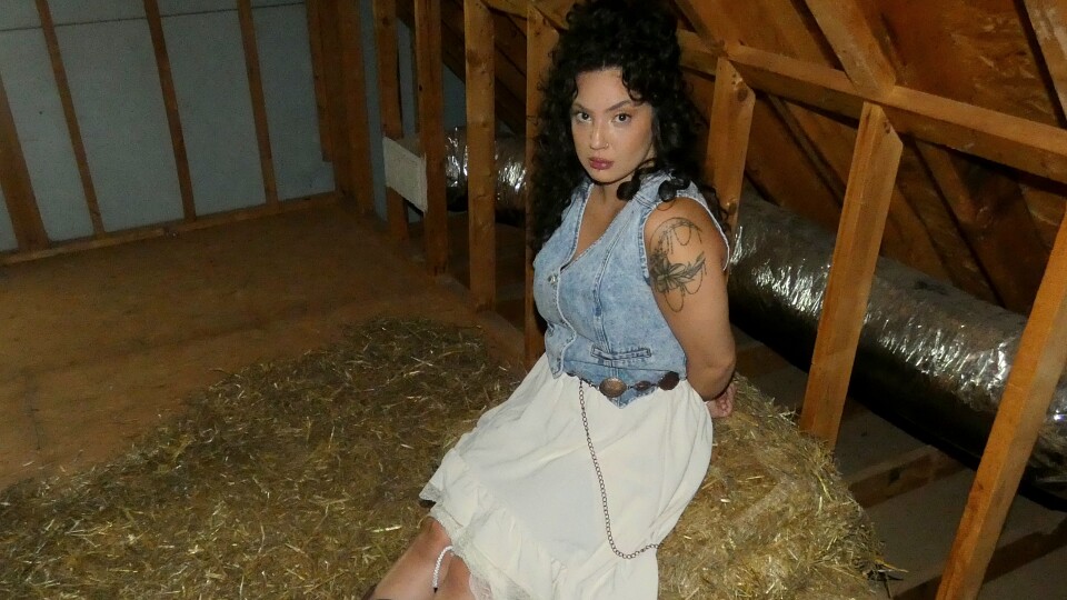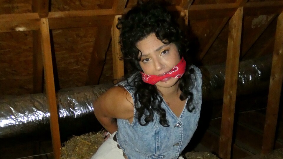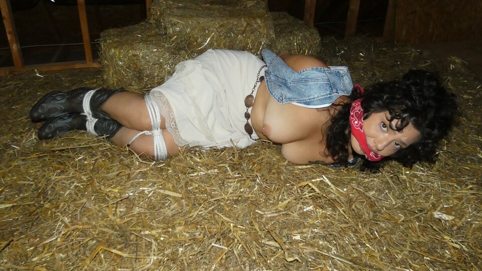 Belle went into thebarn to feed her prized horses. She discovered they were no longer in thebarn. She went back outside and saw her horses being stolen andloaded up. When she confronted the theives she was bound and gagged and taken back into thebarn. She was left there in the hay and told if she moves or calls the police she will be sorry. Before they leave they get a good look at her breasts by undoing her denim vest. She angerly starts to struggle and roll around in the hay trying to get free. Unfortunately its too late as her horses are gone.