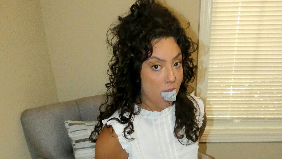 Belle was getting ready for work in the morning. She was all dressed and doing her makeup when she was grabbed from behind. She had no idea someone came into her home. The robbers were unprpared for her to be home. They had to use what they could find in her closet to restrain her. The robbers used her pantyhose and husbands neckties to bind her. They shoved a pair of her panties in her mouth and gagged her with a pair of pantyhose. Belle is struggling in the chair as her house is robbed. She tries to get up and hop away but falls on the bed. The robber notices she was trying to get away so she is hogtied with another pair of pantyhose. She just struggles there as they finally leave. She is definitely not making it to the office on time today.