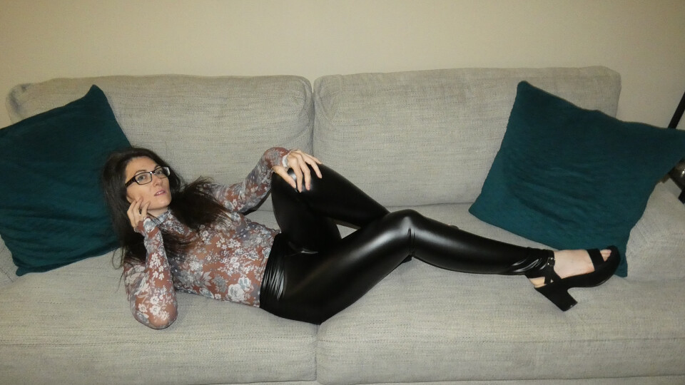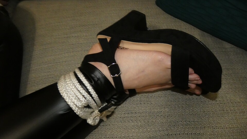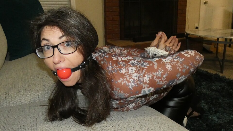Mandie is in leather pants, thin seethrough top and heels. She is all tied up on the couch with a ballgag in her mouth. She will eventually make her way on the floor as she tries to get out of her bonds.