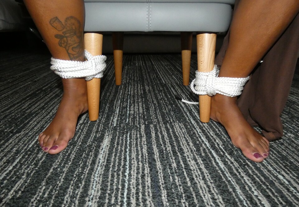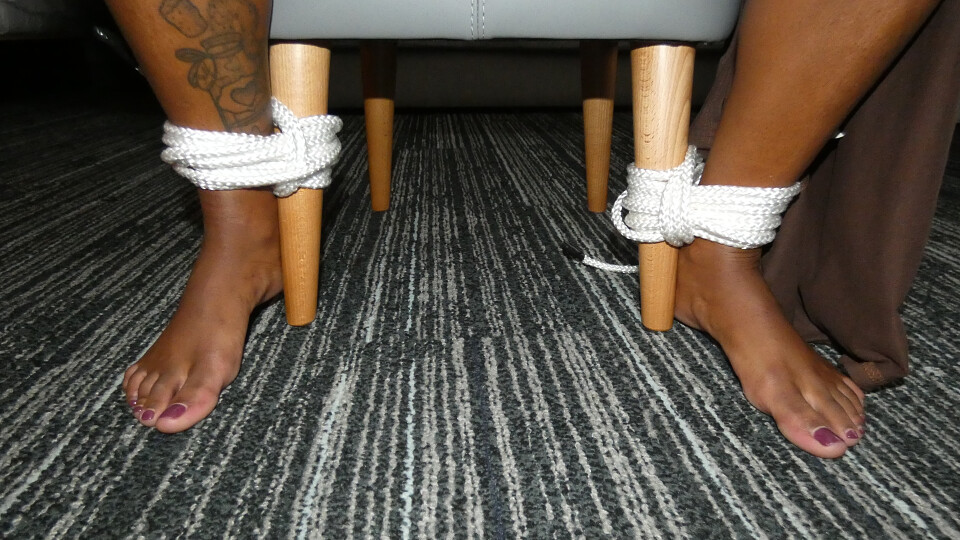Maia is simply tied barefoot in a loose fitting casual dress Her ankles are bound to the legs of a stool and her hands behind her bag. She has microfoam tape over her mouth making a perfect lip imprint. She loves the feeling of the rope and even more so when her dress is pulled down where i can have my hands all over her chest.