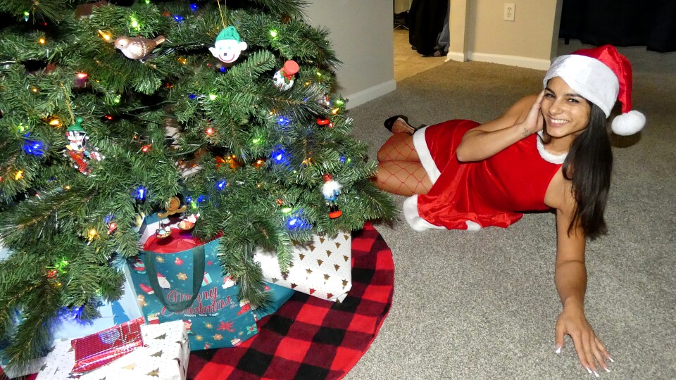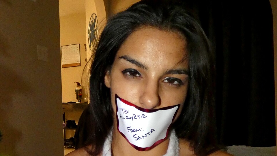 Misty Addams is my 2025 Xmas damsel. Santa left her under my tree in a cute red outfit and heels with red fishnets. She is wrapped with green and red duct tape. She even has a tag over her mouth as a gag.