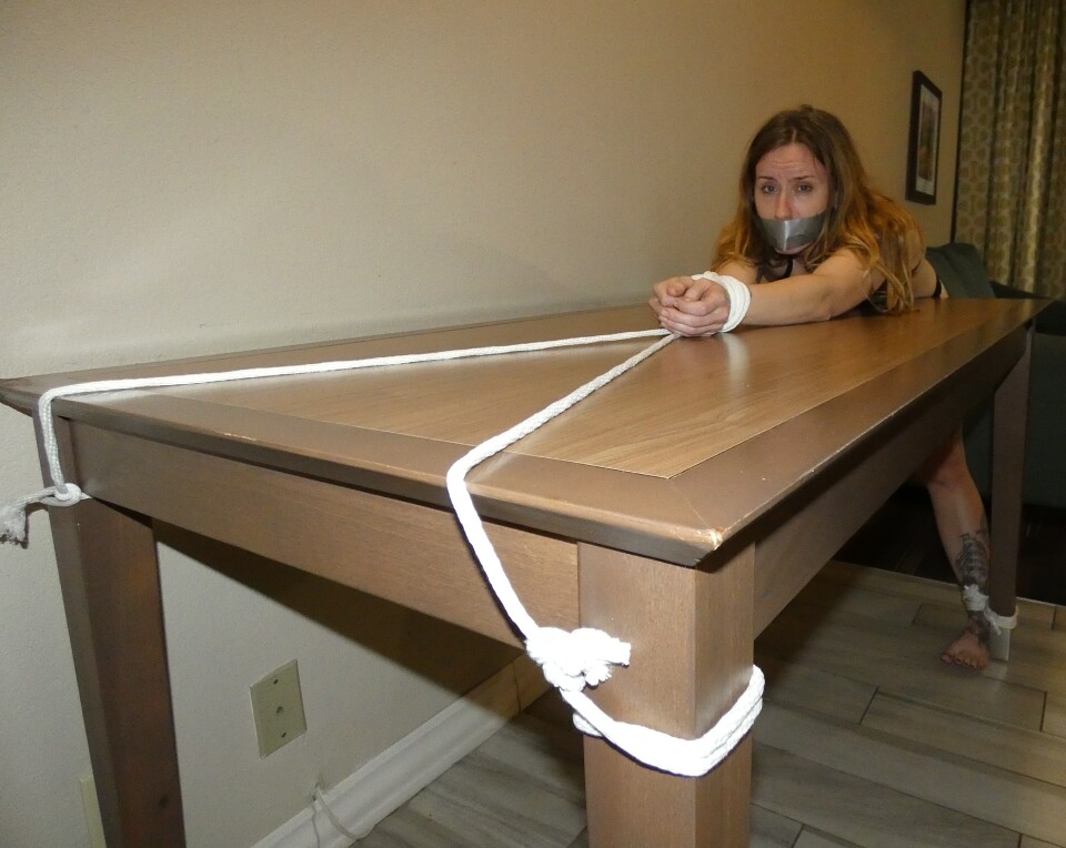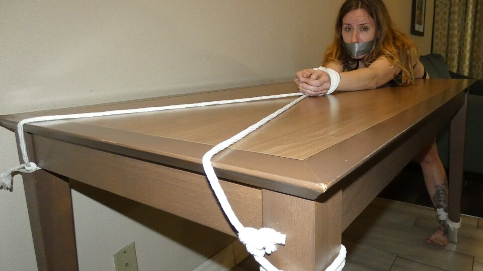 Misty is tied 2 ways in her bra and Panties. She is tied spread accross table with her ass up. She has tape over her mouth. Then she is released but hogtied on top of the table.