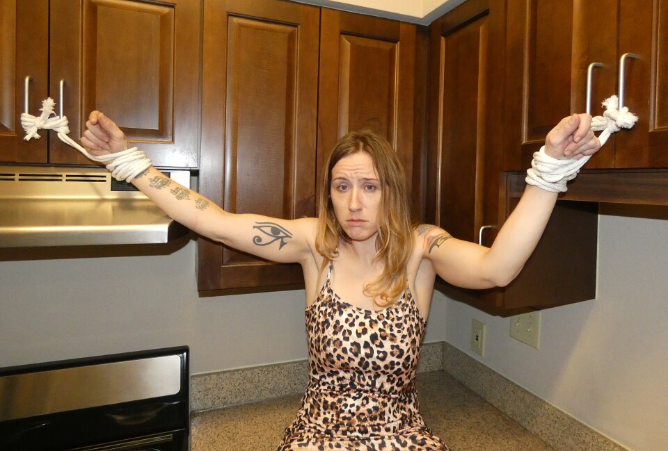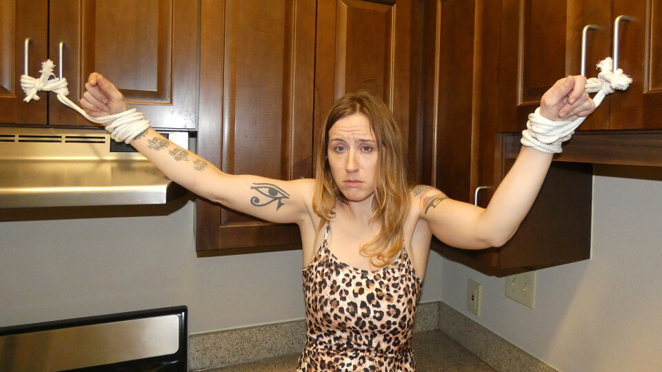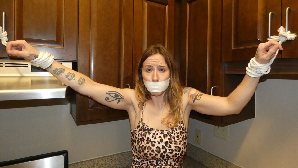Misty is tied spread out on the kitchen countertop wearing a short dress and heels. She is gagged with microfoam tape.